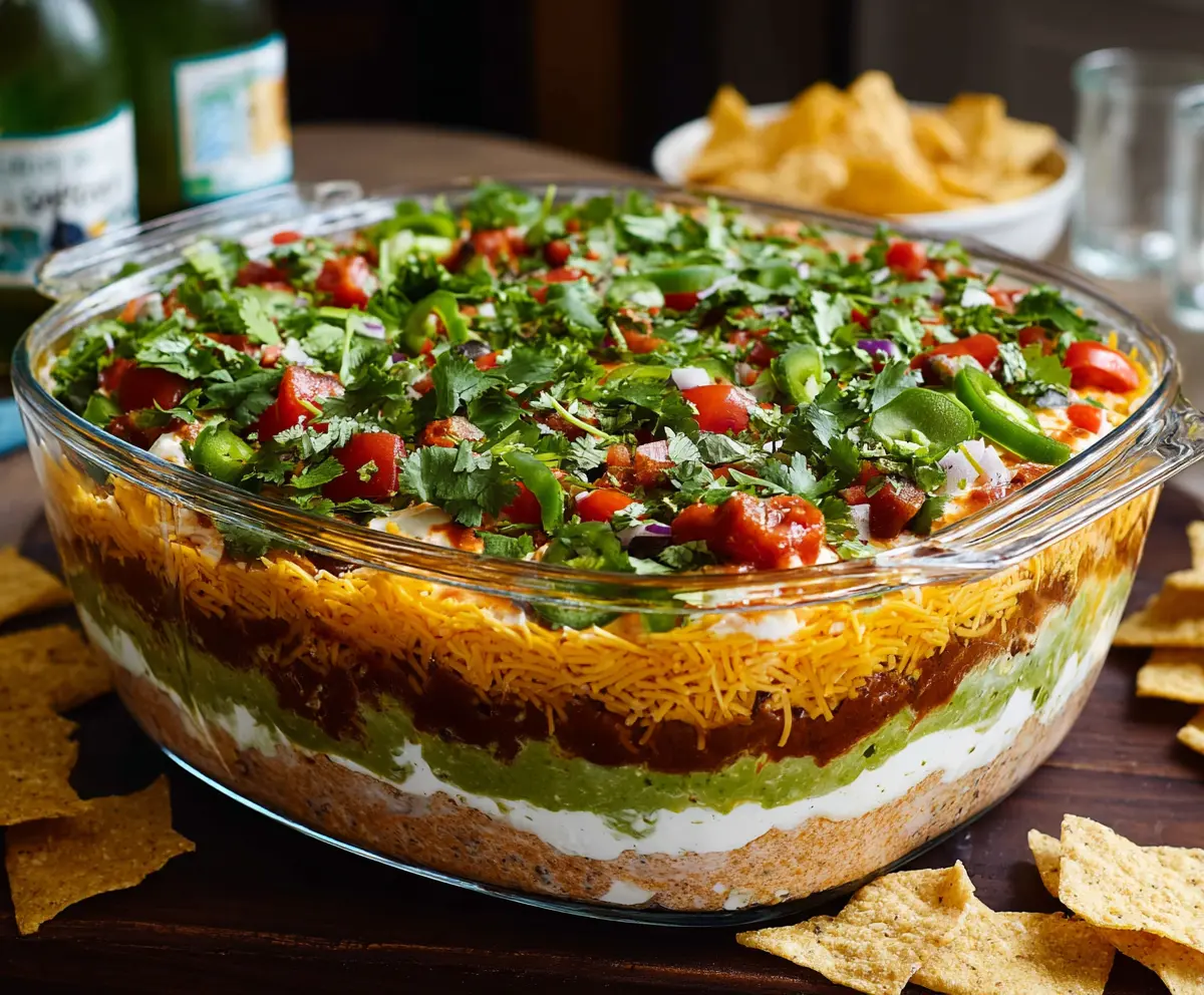Finish off your dip by topping it with diced tomatoes, sliced black olives, chopped green onions, jalapeño slices (if you’re feeling spicy), and a sprinkle of fresh cilantro for a pop of color and flavor.