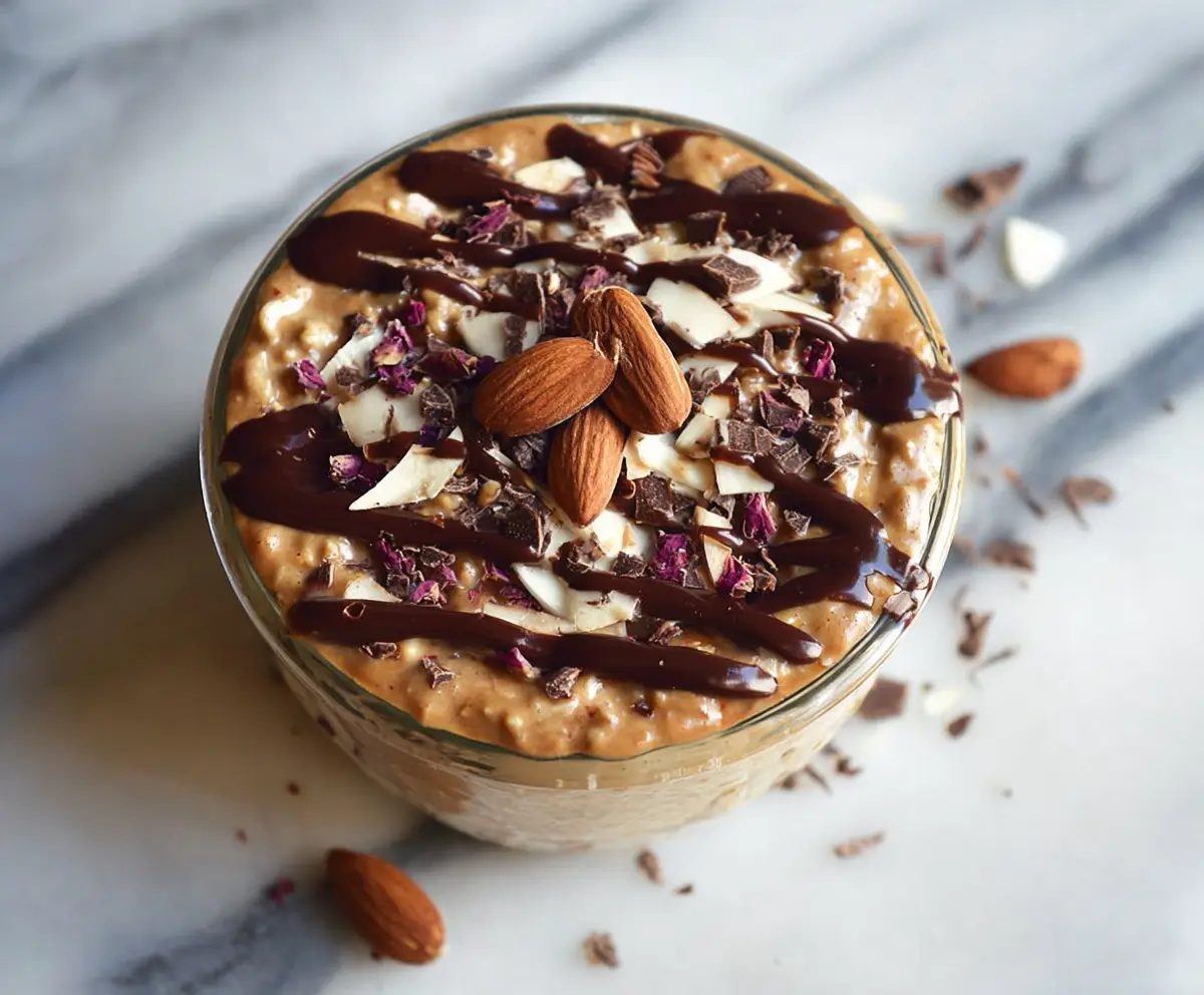 Now, it’s time to make it beautiful and delicious! Top your oats with chopped dark chocolate, sliced almonds, and a drizzle of chocolate syrup for that extra treat. It’s all about that finishing touch!