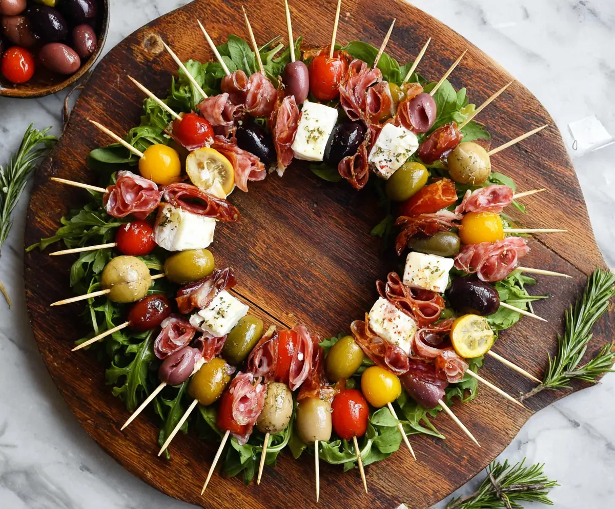 These Antipasto Wreath Skewers are a fun and tasty way to enjoy your favorite Italian bites! Packed with olives, salami, cheese, and veggies, they look great and taste even better.