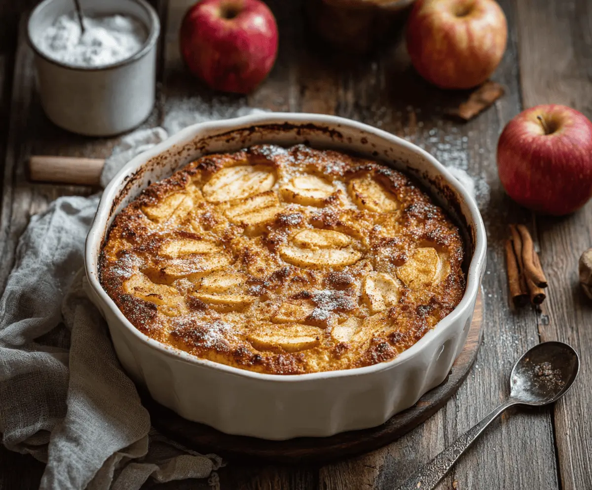 Delicious Apple Cinnamon Cottage Cheese Bake in a baking dish, topped with cinnamon and apple slices.