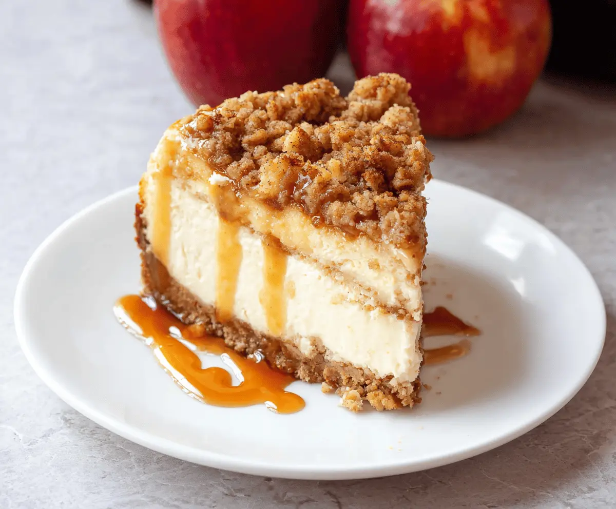 Delicious apple crisp cheesecake topped with cinnamon-spiced apple slices and crunchy streusel crumble, perfect for dessert lovers.