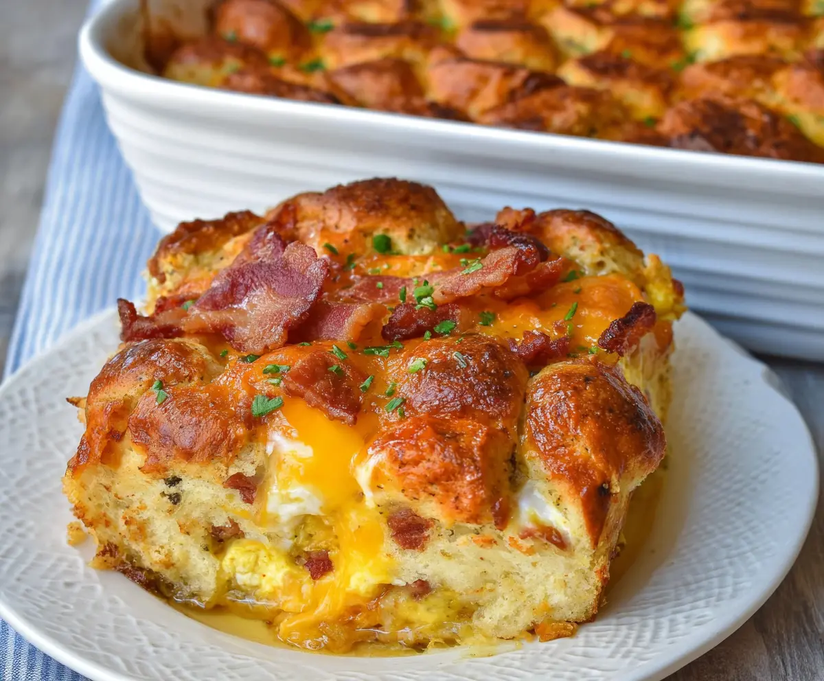 This Bacon Egg and Cheese Biscuit Bake is a tasty breakfast surprise! It features crispy bacon, fluffy eggs, and melted cheese all nestled in buttery biscuit dough.