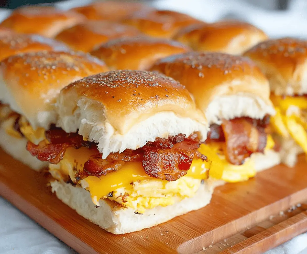 These Bacon Egg and Cheese Breakfast Sliders are a tasty way to start your day! They are soft rolls filled with crispy bacon, fluffy eggs, and melted cheese, all packed into one delicious bite.