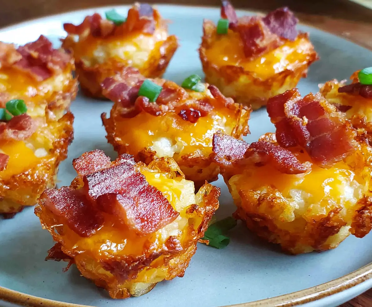 These Bacon Tater Tot Cups are a fun and tasty treat! Crispy tater tots form a little bowl filled with cheese and crispy bacon, making them perfect for snacking or parties.