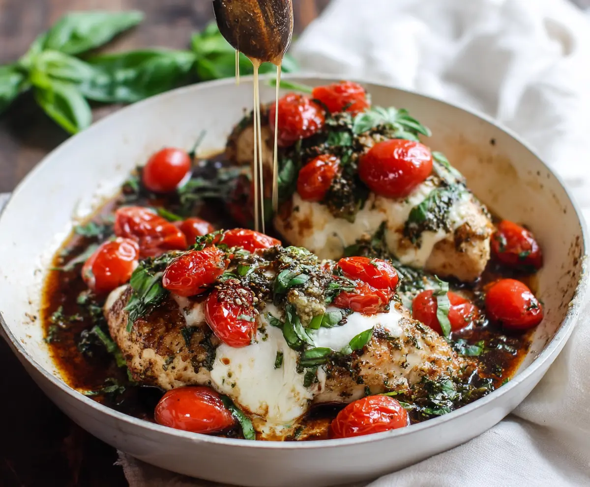 Right before serving, drizzle the balsamic glaze over the chicken and tomatoes. This adds a lovely sweet-tangy finish!