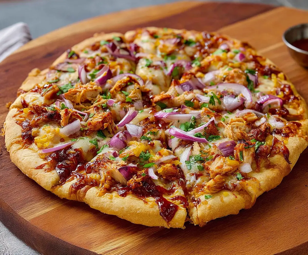 Delicious BBQ Chicken Pizza with melted cheese and smoky barbecue sauce.