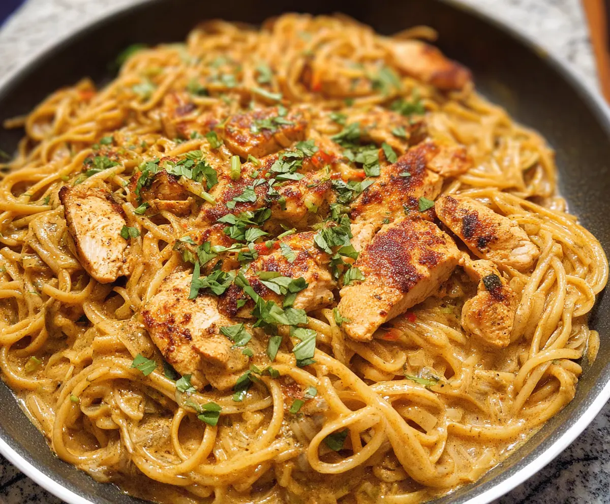 Now, it’s time to bring it all together! Return the cooked chicken to the skillet along with the drained spaghetti. Toss everything until the pasta is well coated with the creamy Cajun sauce and evenly mixed.