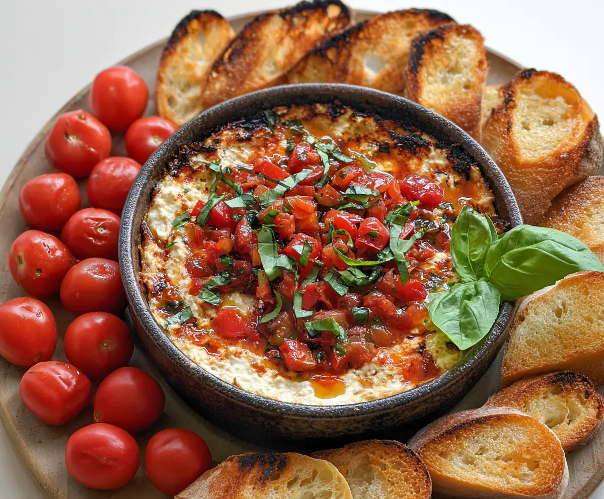 Enjoy your warm Bruschetta Dip with the toasted bread slices and extra cherry tomatoes on the side for garnish. Perfect for sharing (or not!). Dive in and enjoy!