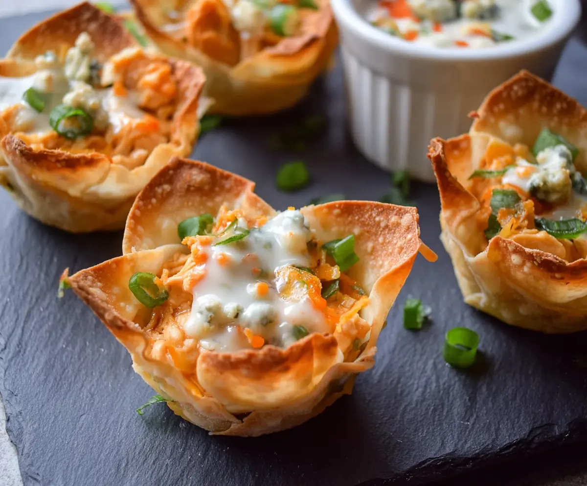 These Buffalo Chicken Wonton Cups are fun little bites filled with spicy, shredded chicken and creamy sauce, all wrapped in crispy wonton shells. Perfect for parties or game days!
