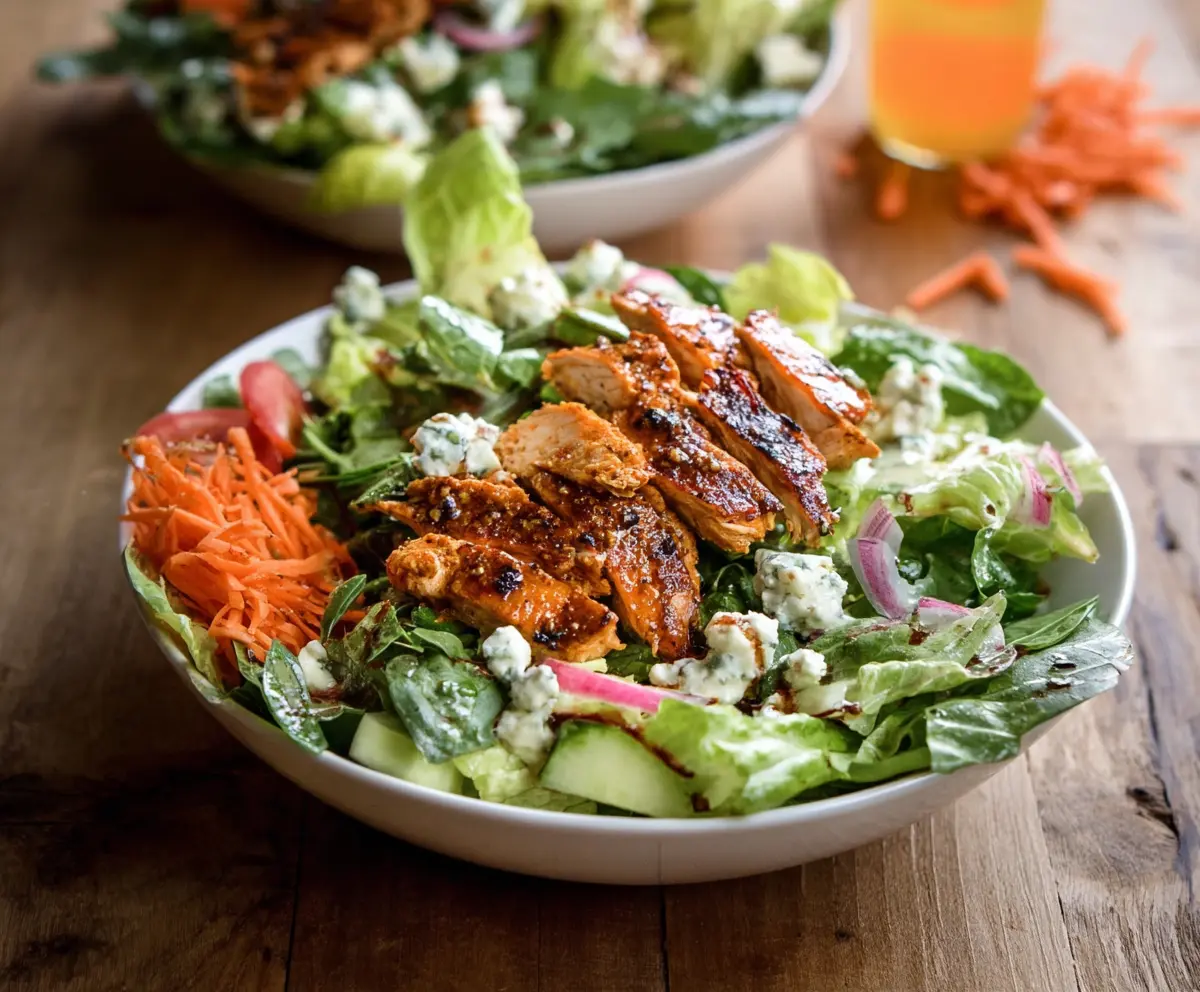 Now, place the slices of buffalo chicken on top of your salad mixture. Drizzle ranch dressing all over the salad. You can either toss everything together gently or serve the ranch dressing on the side for dipping!
