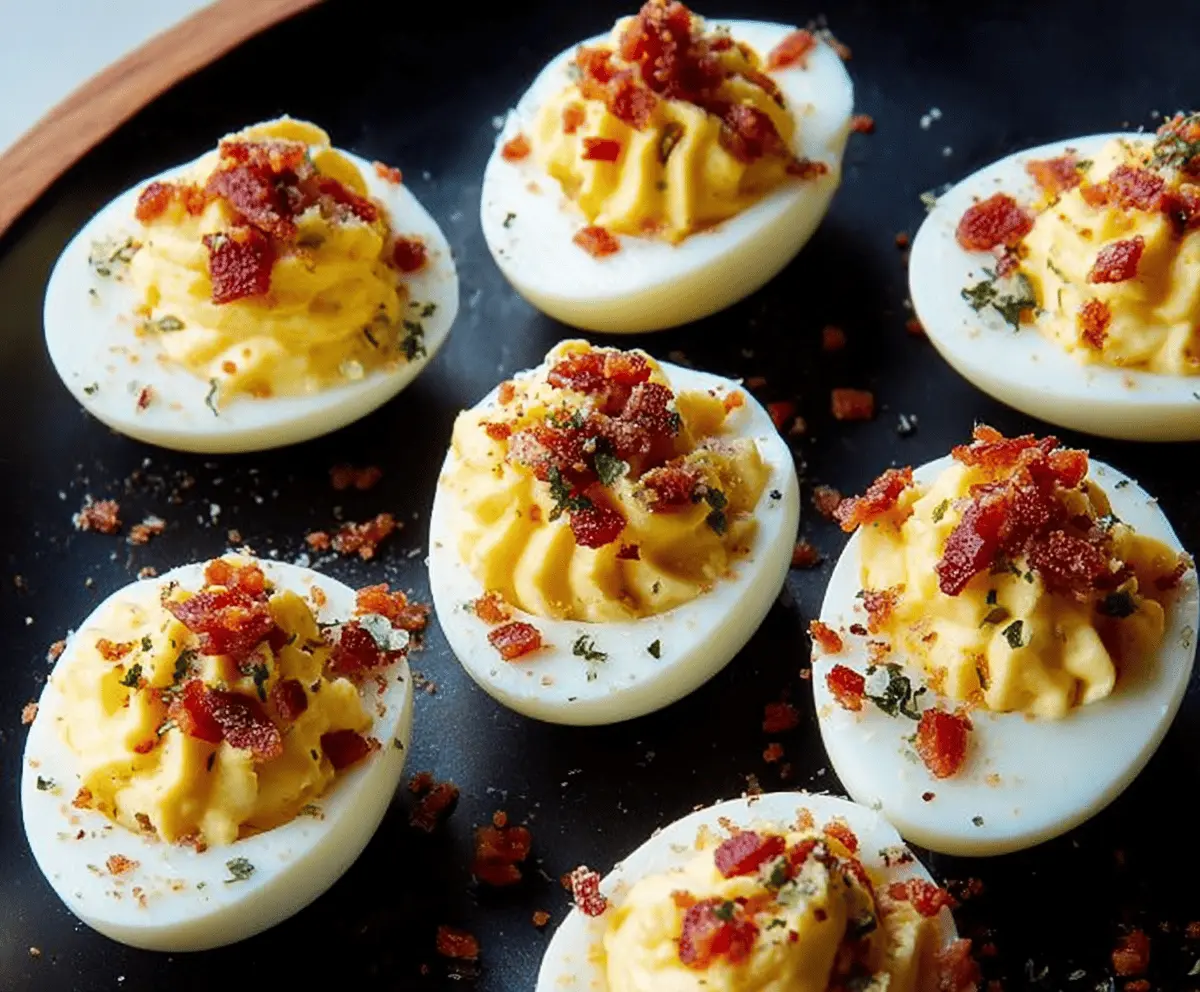 Who doesn’t love a good deviled egg? Add the crispy bacon and cheesy touch, and you’ve got a hit for any party. I can’t help but smile when I see them on the table! 🎉