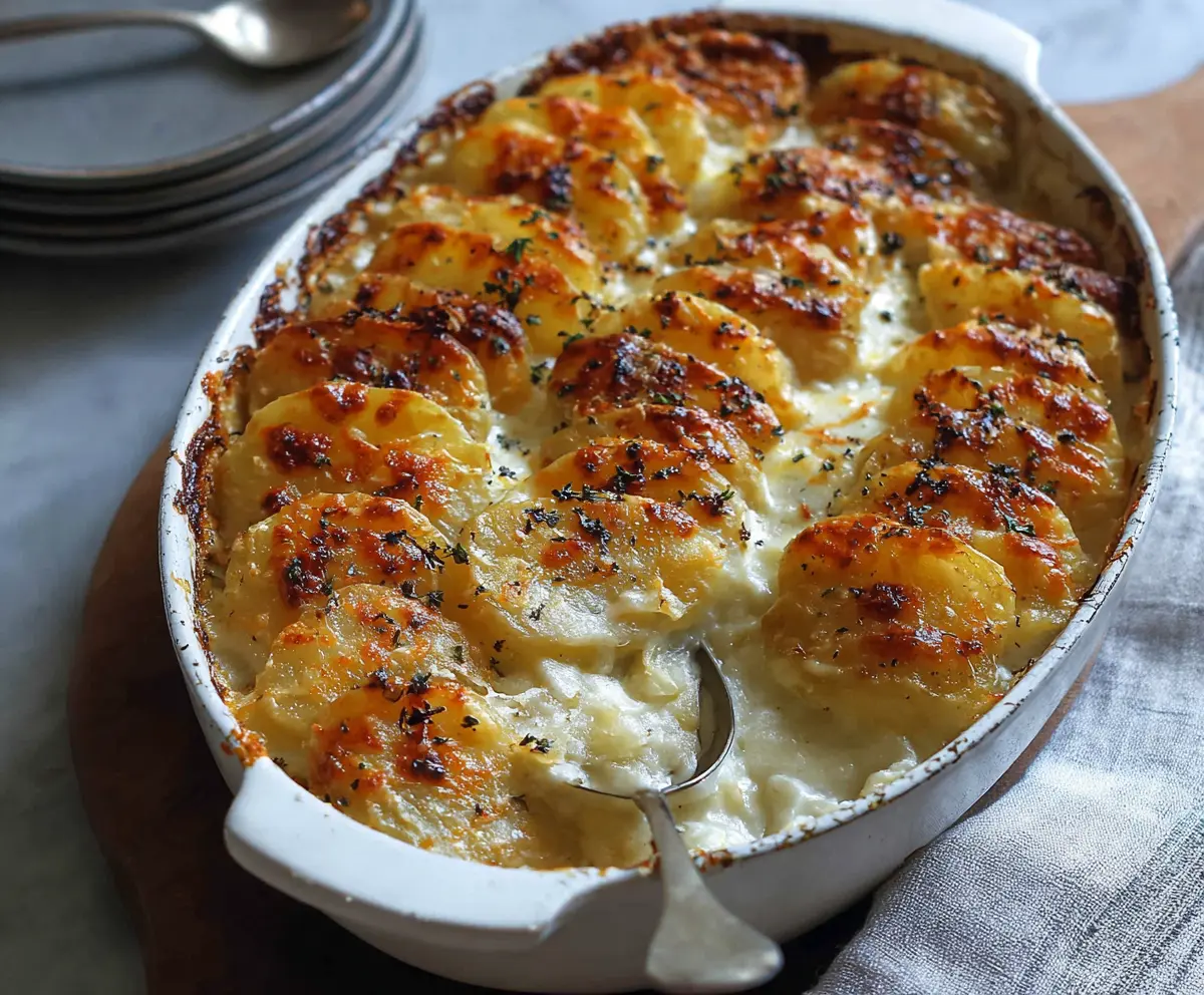 Finally, garnish your gorgeous potato bake with dried thyme or finely chopped fresh parsley for a pop of color. Serve warm and enjoy every cheesy bite!