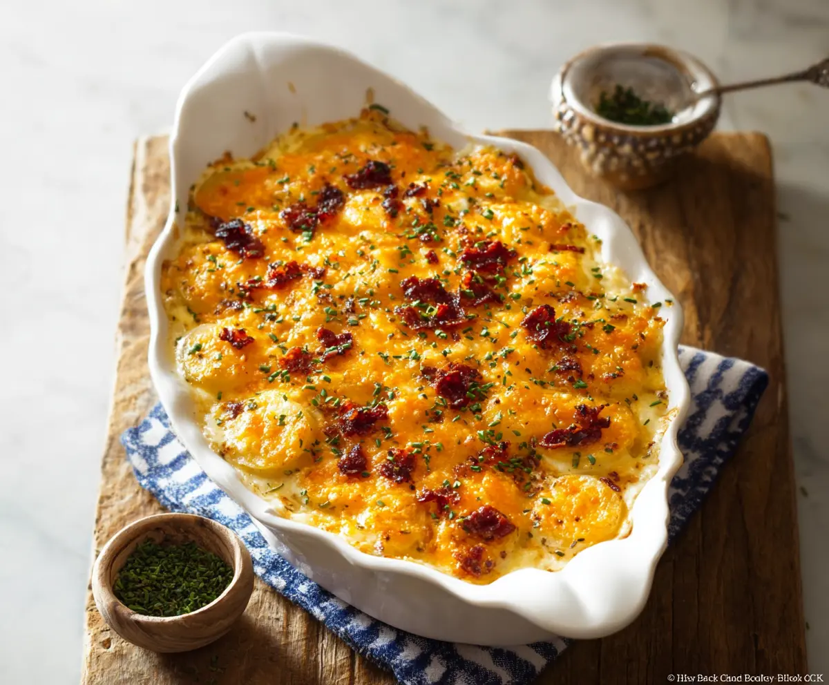 Enjoy your creamy, cheesy, bacon-filled potato casserole as a hearty side dish for any family meal—it’s sure to be a hit!