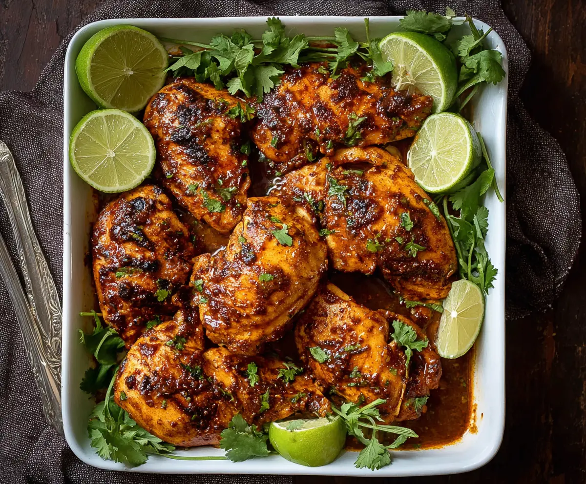 Garnish the chicken with freshly chopped cilantro or parsley and serve with lime wedges on the side for an extra pop of flavor. Enjoy this spicy, tangy delight with your favorite sides!