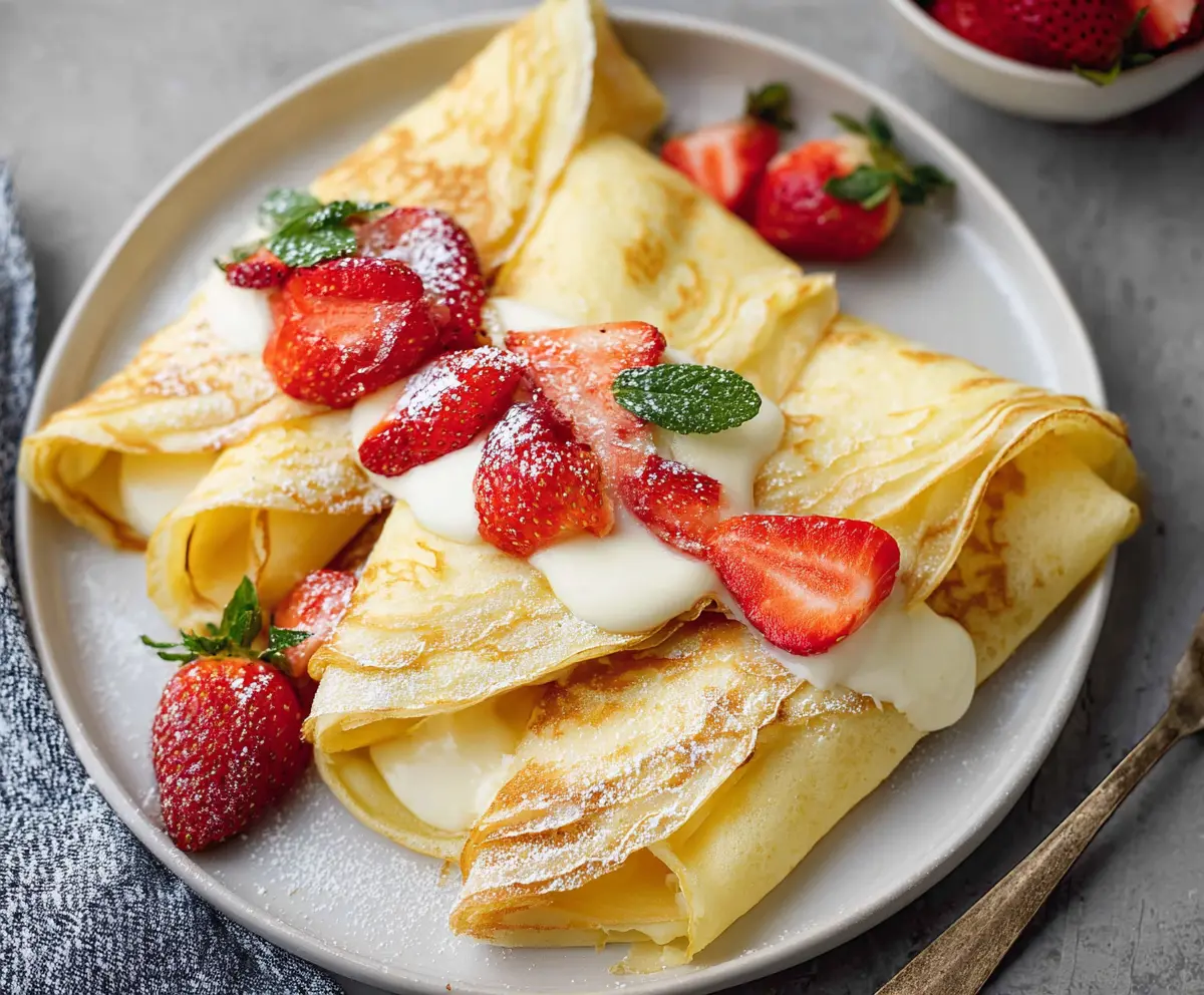 Delicious homemade cottage cheese crepes served on a plate, perfect for breakfast or brunch.