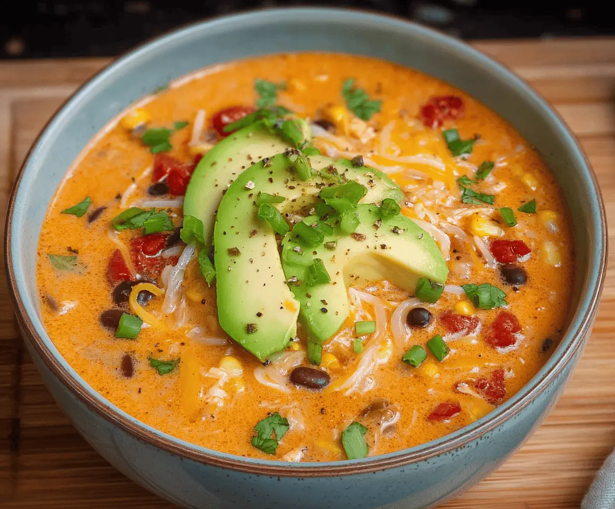 This creamy enchilada soup is rich, spicy, and filled with hearty textures from the beans, corn, and chicken. The toppings add freshness and crunch, making every spoonful a delight. Enjoy and share with friends and family!