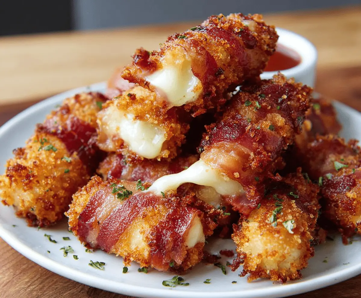 These crispy bacon mozzarella poppers are a fun snack! They are gooey inside with a crunchy bacon wrap outside, making every bite a tasty joy. Perfect for parties or game days!