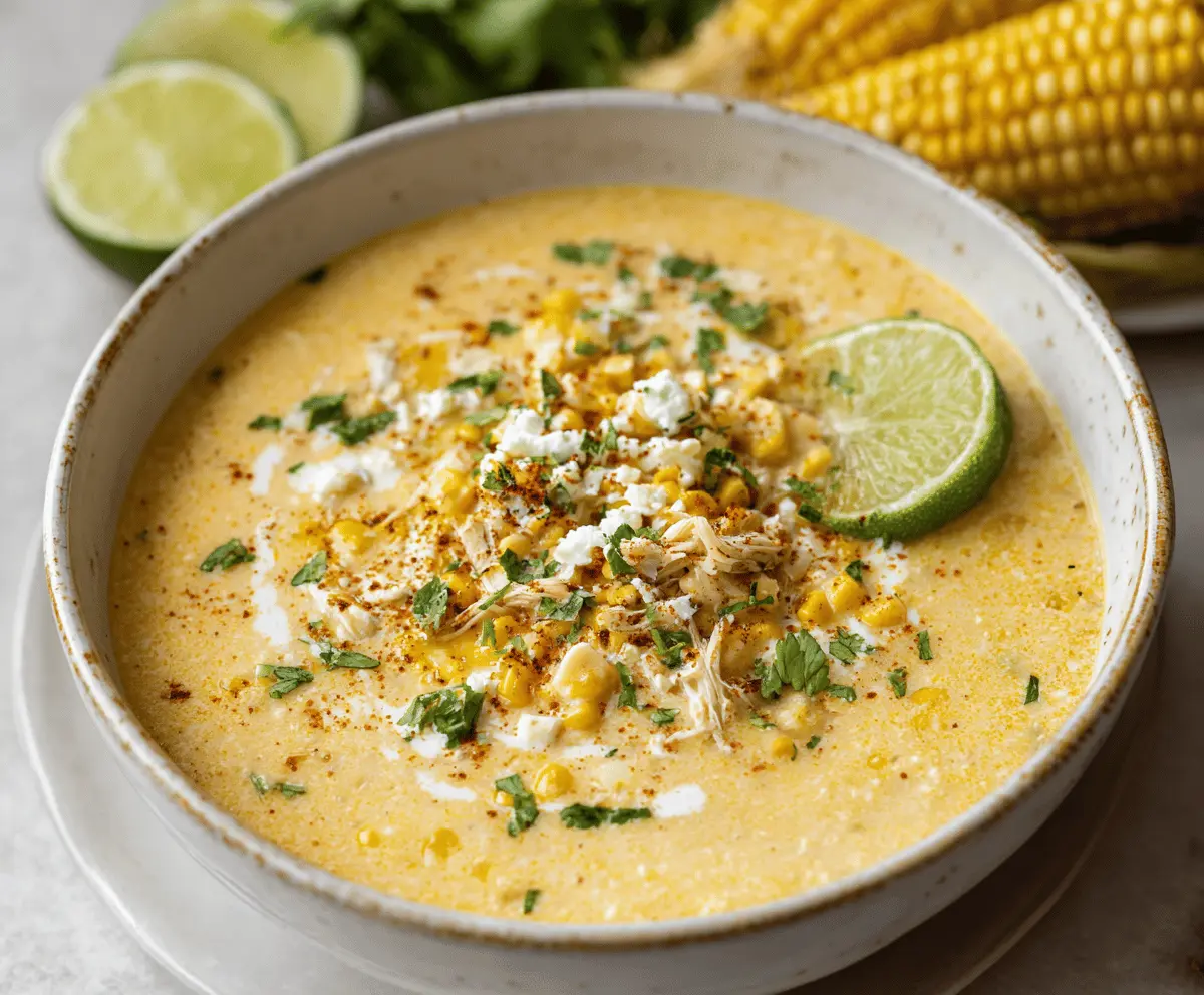 Creamy Elote Corn Soup garnished with fresh cilantro, lime wedges, and crumbled cheese, served in a rustic bowl