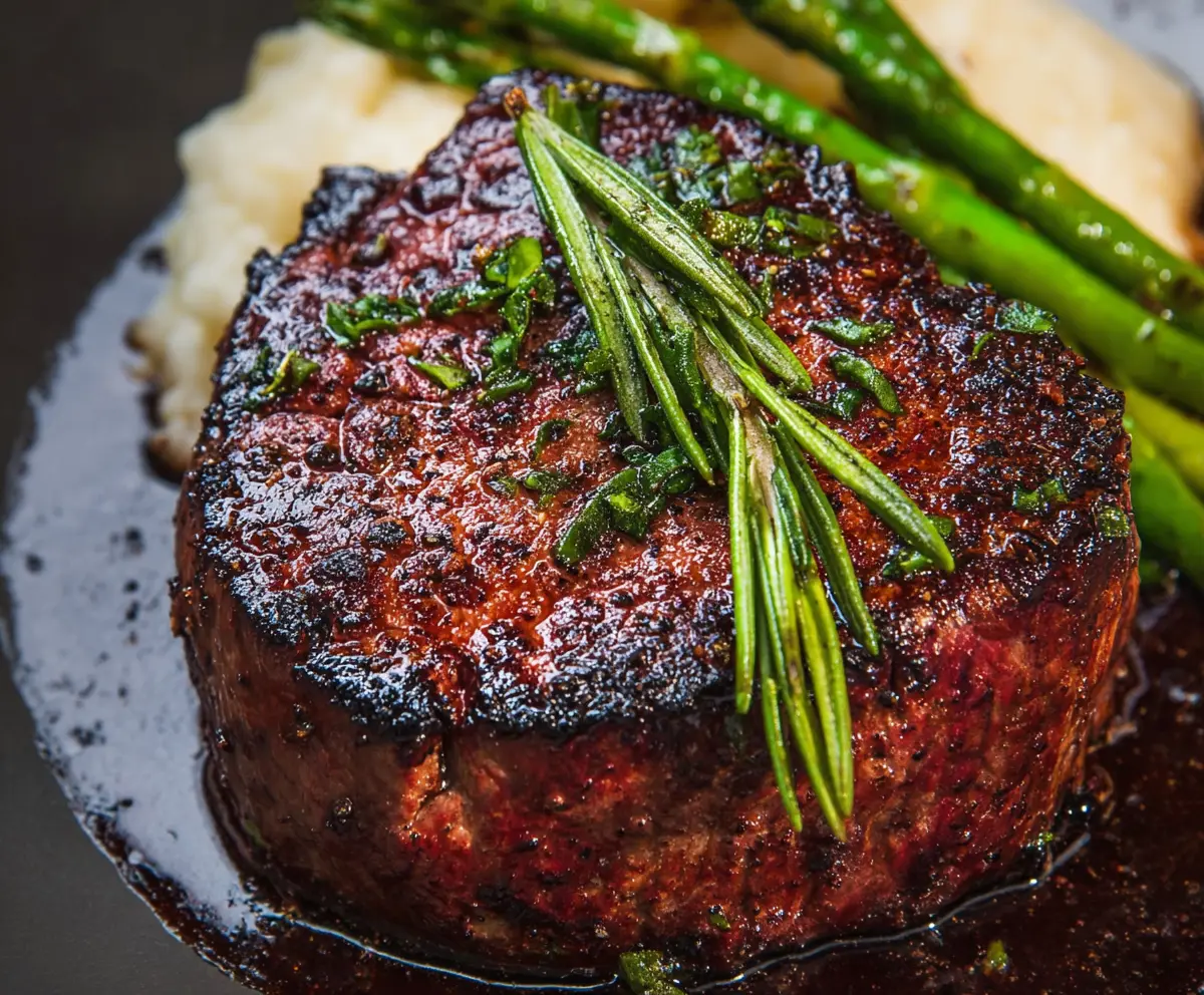 This classic preparation highlights the tender, buttery texture of the filet mignon with aromatic rosemary and savory mushrooms, perfectly complemented by vibrant asparagus. Enjoy!