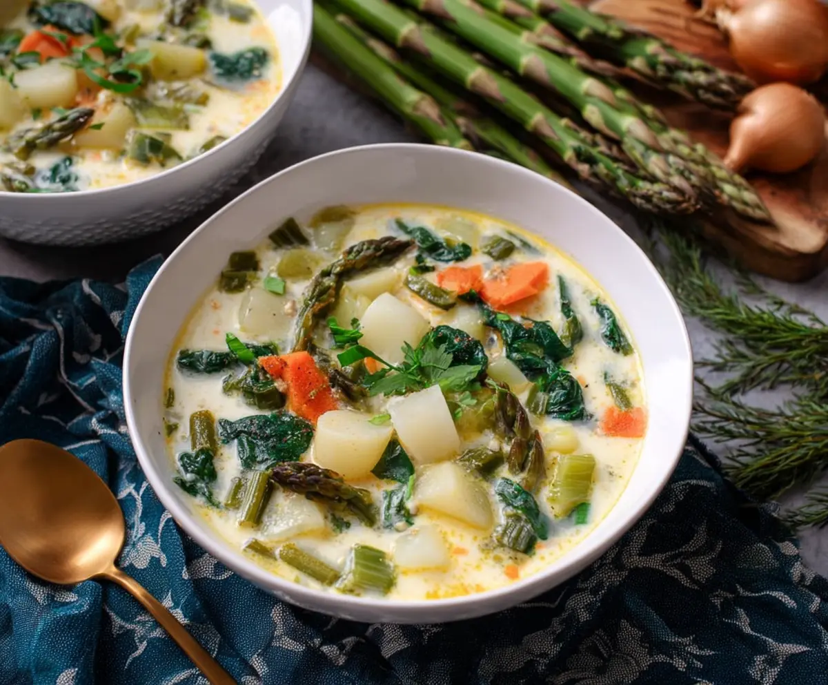 Delicious French Spring Soup with fresh herbs, colorful vegetables, and a steaming bowl served in a rustic setting.