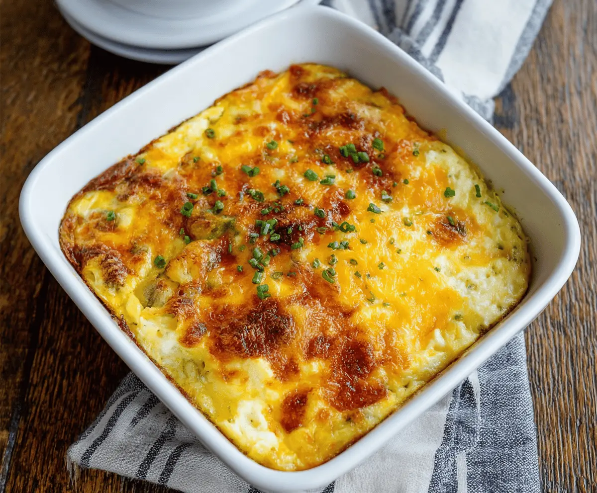 Once done, remove the casserole from the oven and allow it to cool for about 5 minutes. This helps it firm up nicely. Finally, garnish with chopped fresh chives or green onions for a pop of color and extra flavor!