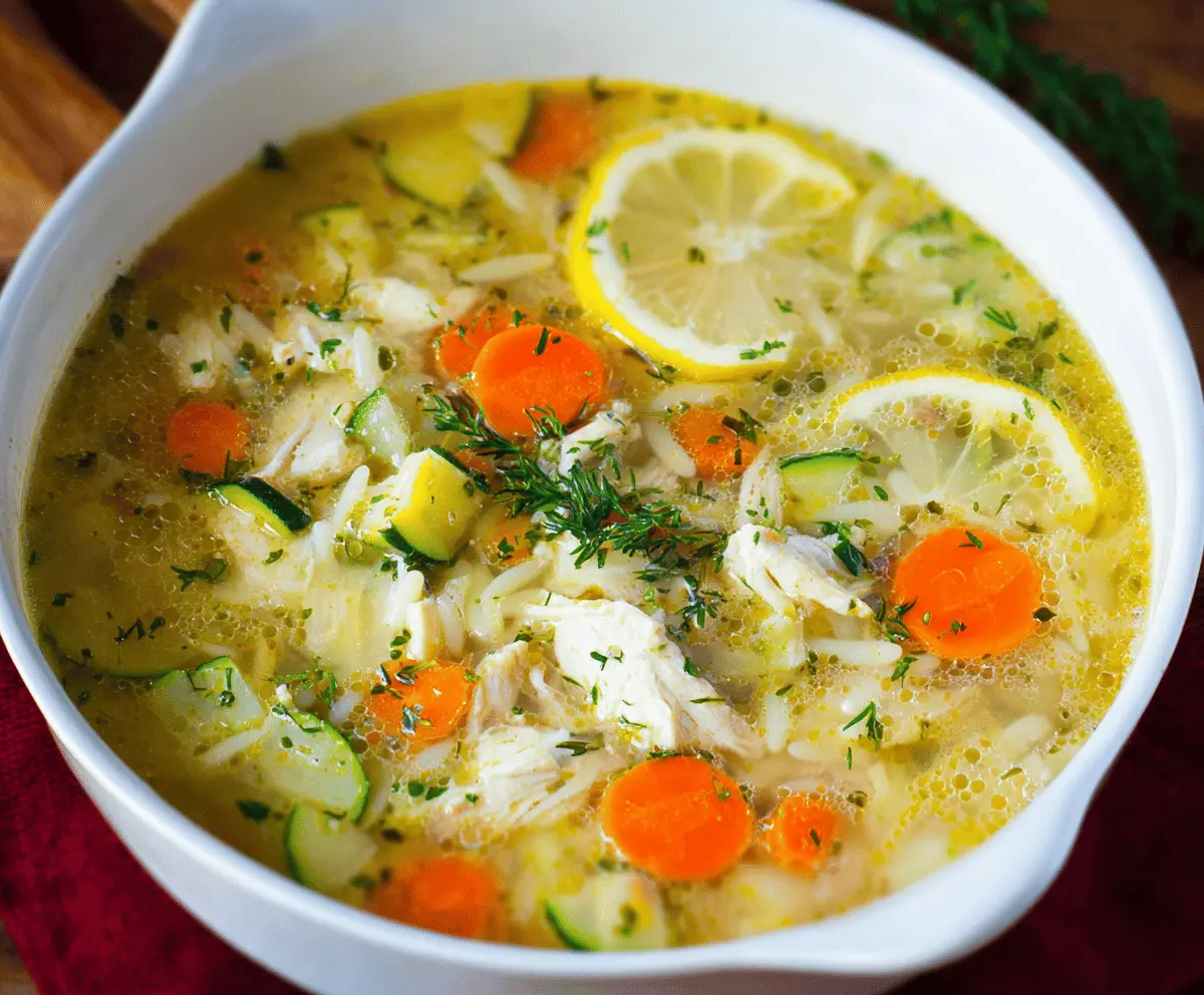 A steaming bowl of Greek Lemon Orzo Chicken Soup garnished with fresh herbs, featuring tender chicken, orzo pasta, and vibrant lemon flavor on a rustic wooden table.