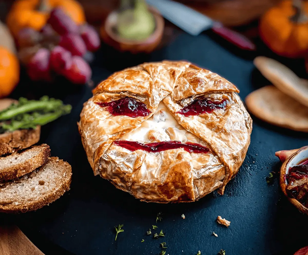 Get ready for a spooky delight with Halloween Baked Brie! This creamy cheese is wrapped in flaky pastry and baked until golden, with a touch of sweet fruit jam inside.
