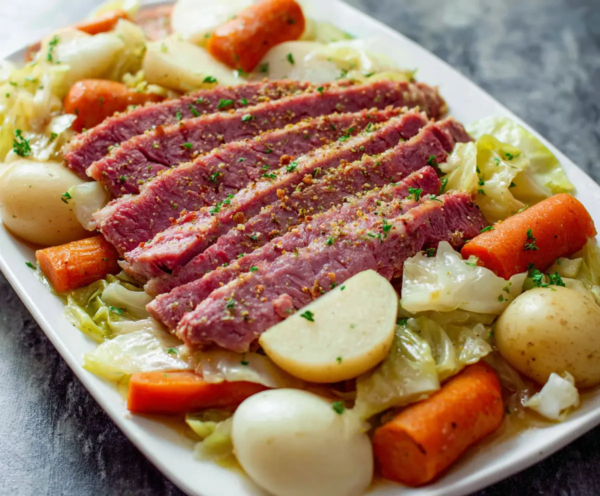 Let the corned beef rest for about 5 minutes. After resting, slice it against the grain into nice, tender pieces. Arrange the sliced meat on a large platter and surround it with the tasty vegetables.