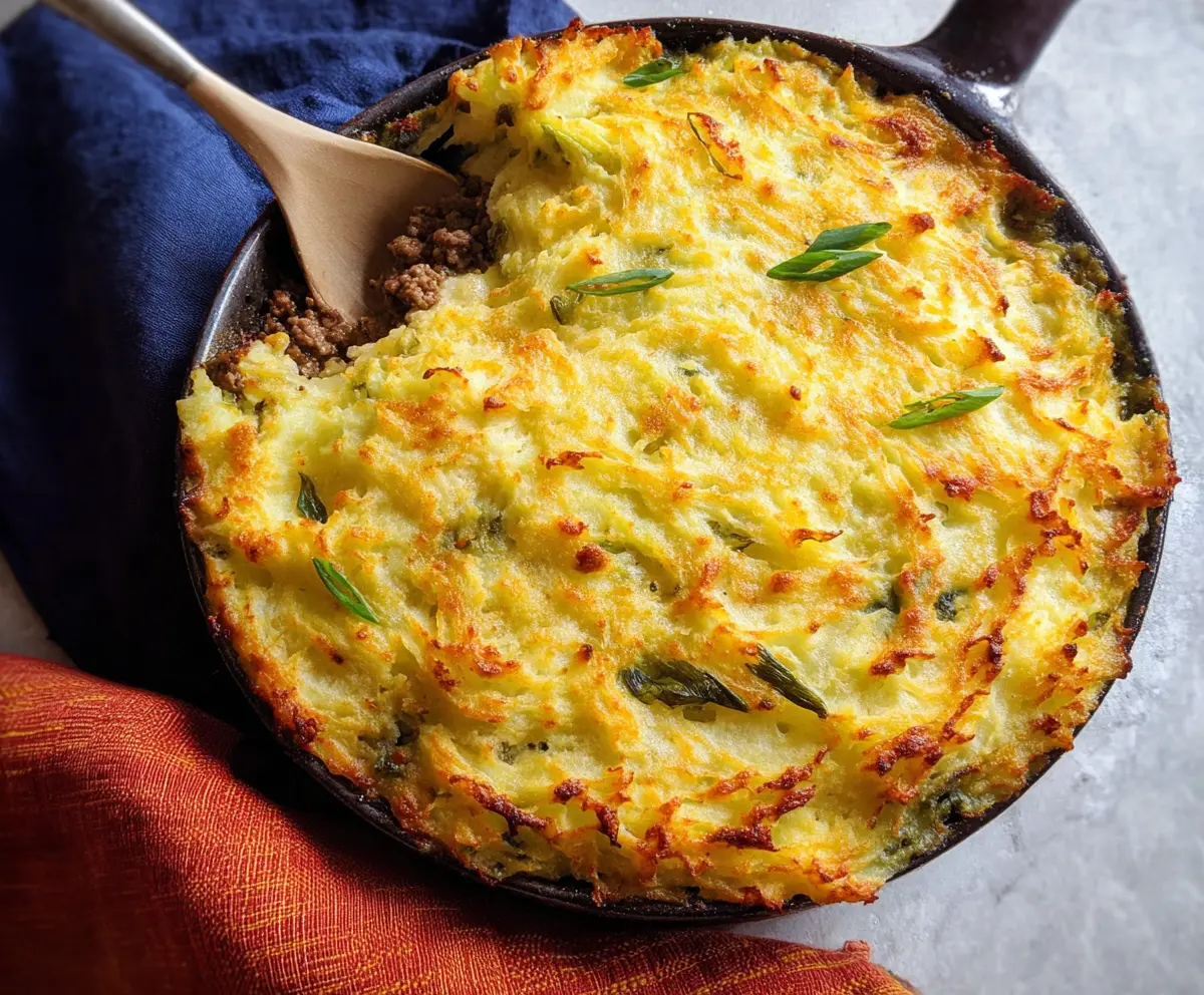 Delicious homemade Irish Cottage Pie with seasoned ground beef and creamy mashed potatoes, served in a rustic dish.