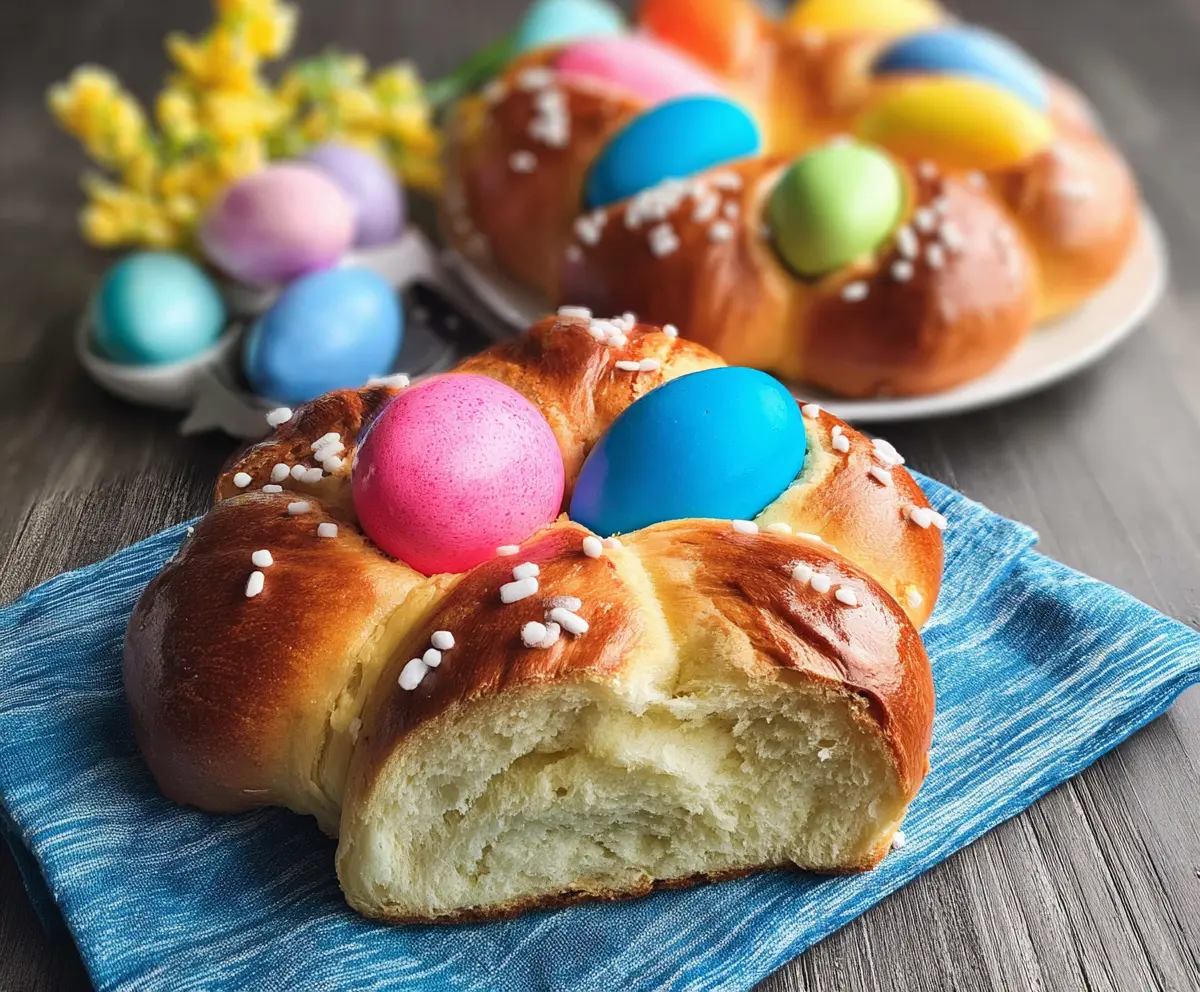 Delicious Italian Easter bread adorned with vibrant, colorful eggs for a festive celebration.