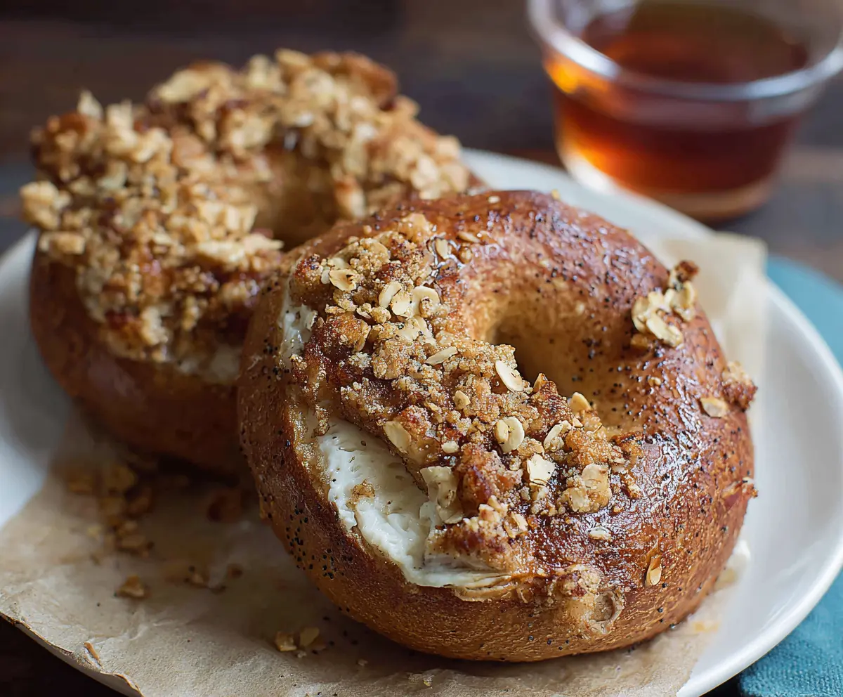 Enjoy your delicious Maple French Toast Bagels with a crunchy oat topping and a sweet maple glaze!