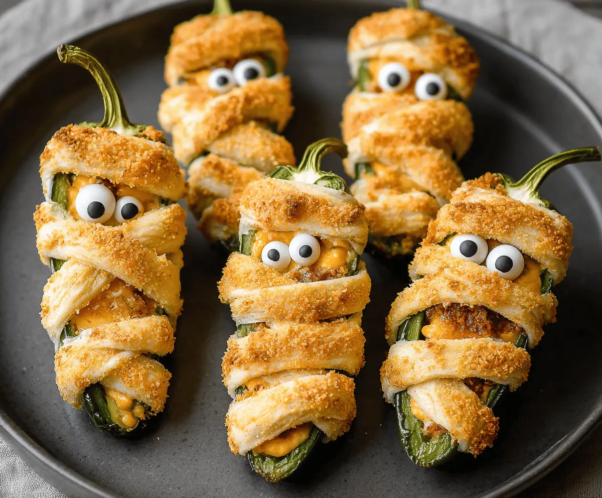 Mummy Jalapeño Poppers are a fun and spooky snack! These little bite-sized treats are stuffed with cream cheese and wrapped in crescent dough to look like mummies. Perfect for Halloween!