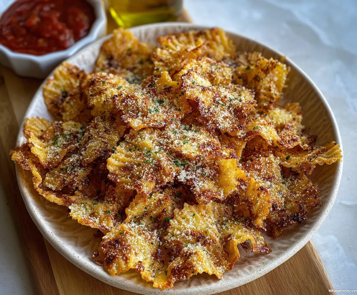 Transfer your pasta chips to a serving plate. If you like, you can sprinkle some extra grated Parmesan on top and add finely chopped chives for a pop of color. Serve them alongside marinara or your favorite dipping sauce for a fun snack or appetizer.