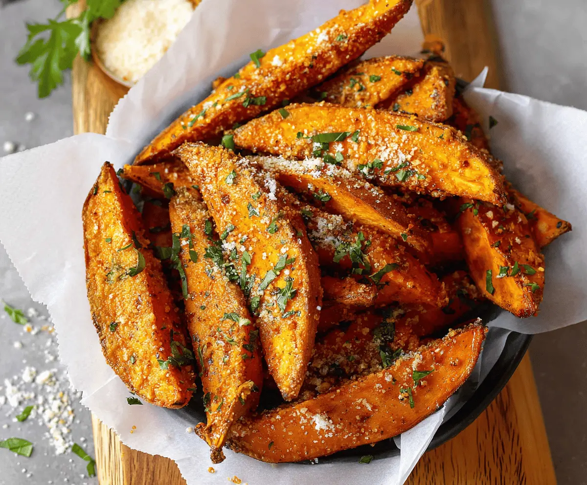 These Parmesan Garlic Sweet Potato Wedges are crispy, crunchy, and bursting with flavor. Tossed in garlic and topped with cheesy goodness, they make a perfect side dish!