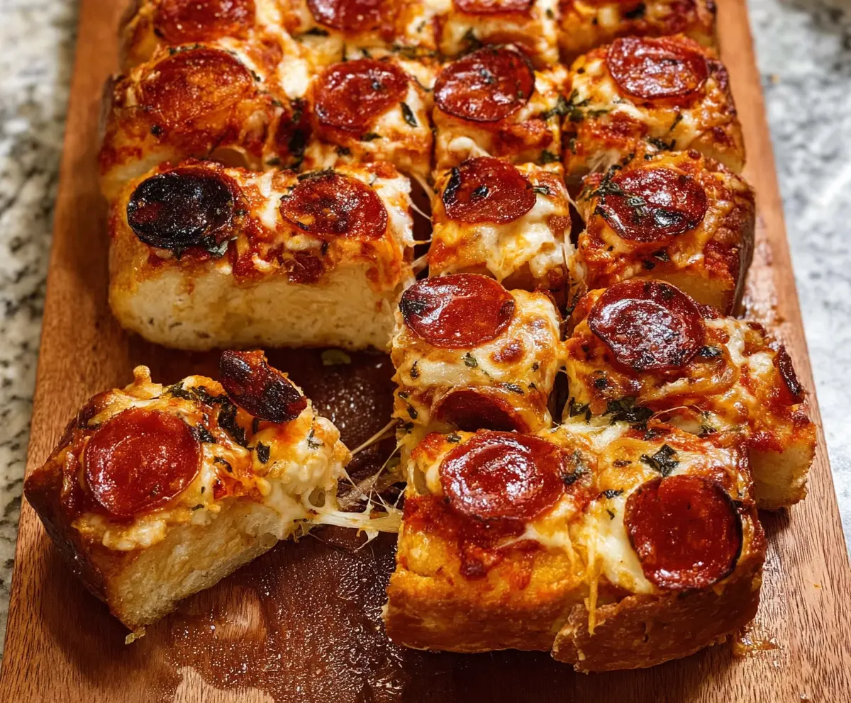 Once baked, remove the pizza bread from the oven and let it cool for a few minutes. Cut it into squares and serve warm, with extra pizza sauce on the side for dipping if you like. Enjoy your homemade pepperoni pizza bread!