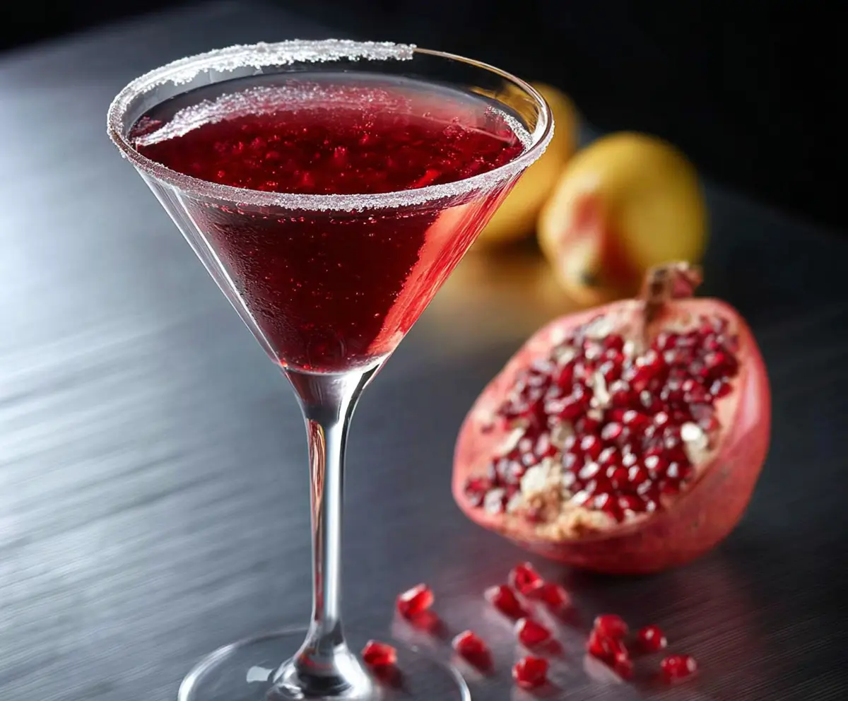 Elegant Pomegranate Martini in a crystal glass garnished with fresh pomegranate seeds and a lime wedge.