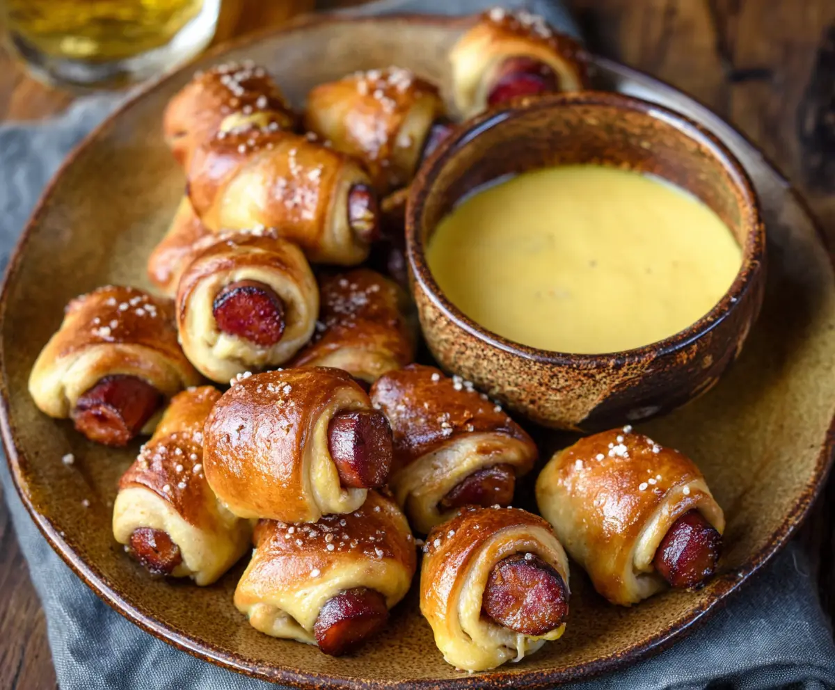 Delicious pretzel pigs in a blanket served with creamy beer cheese dip, perfect for snacking or parties.