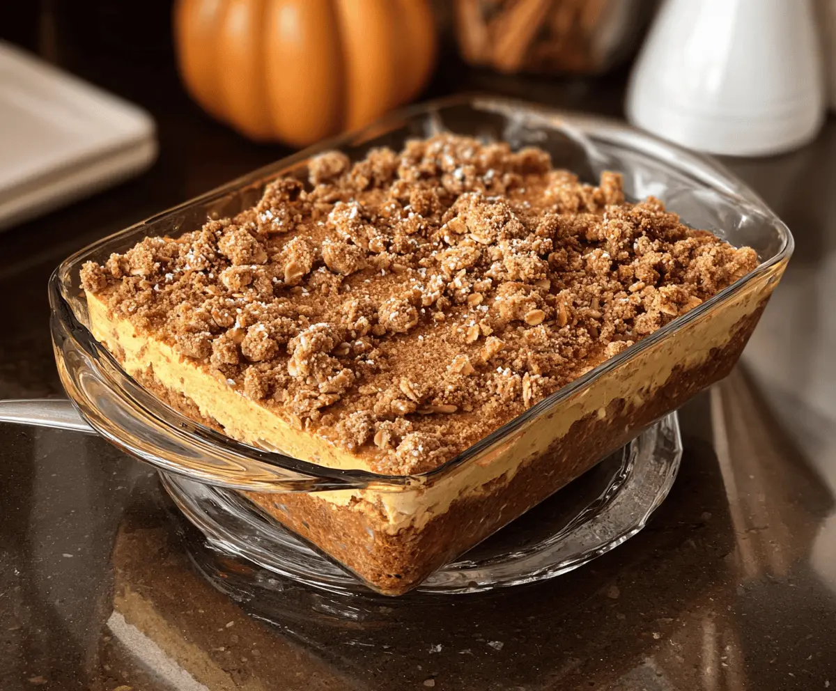 Cover the dessert and refrigerate it for at least 2 hours (or overnight if you can wait!). This lets all the flavors meld beautifully together. When you’re ready to serve, scoop out portions that have both the creamy filling and the crunchy topping. For an extra festive touch, sprinkle some cinnamon or pumpkin pie spice on top!
