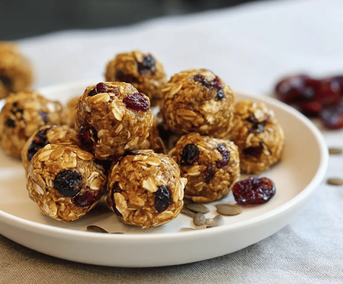 Healthy Pumpkin Cranberry Energy Bites with oats, nuts, and seeds on a white plate, perfect for a nutritious snack