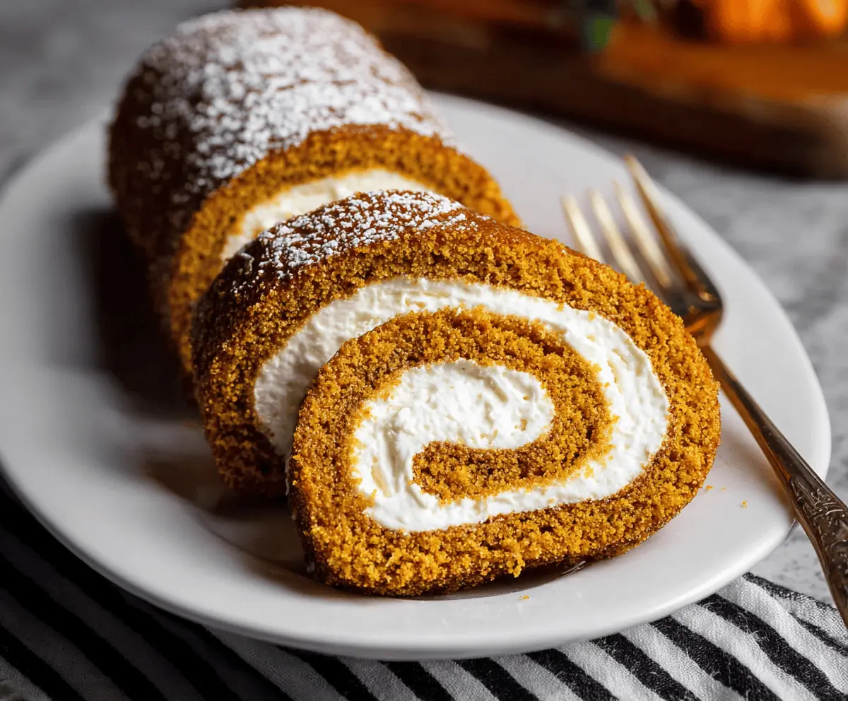 This dessert features a soft, spiced pumpkin sponge with a creamy filling, rolled into an elegant swirl dusted with powdered sugar. It’s sure to impress your friends and family!