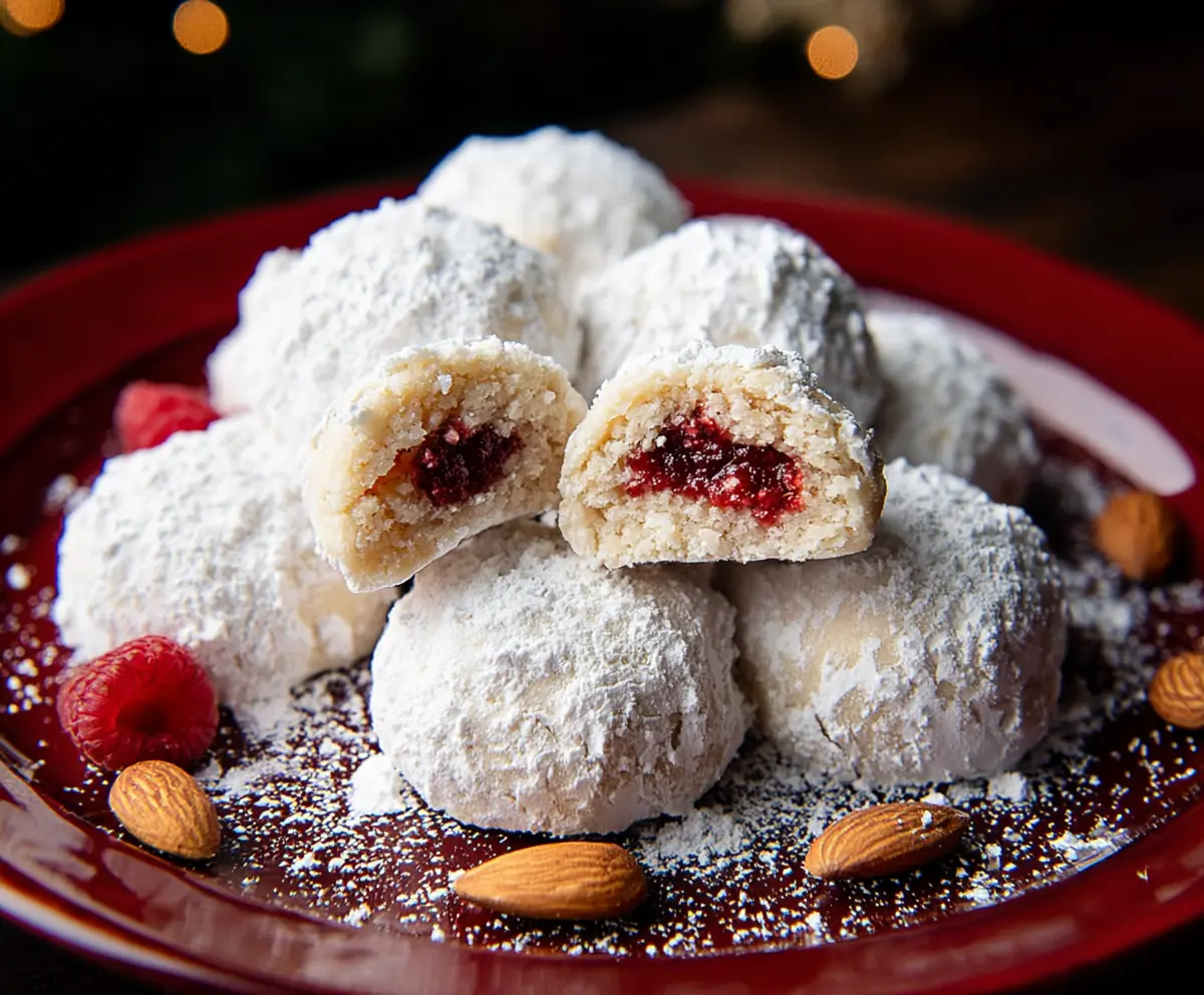 These Raspberry Almond Snowball Cookies are tiny bites of happiness! With their soft, buttery texture and a sweet burst of raspberry jam inside, they are perfect for sharing.