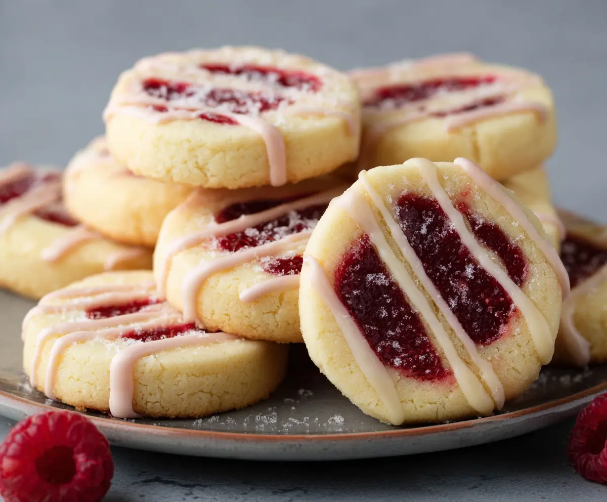 Enjoy your tender, buttery shortbread cookies with vibrant raspberry centers and a sweet glaze drizzle!