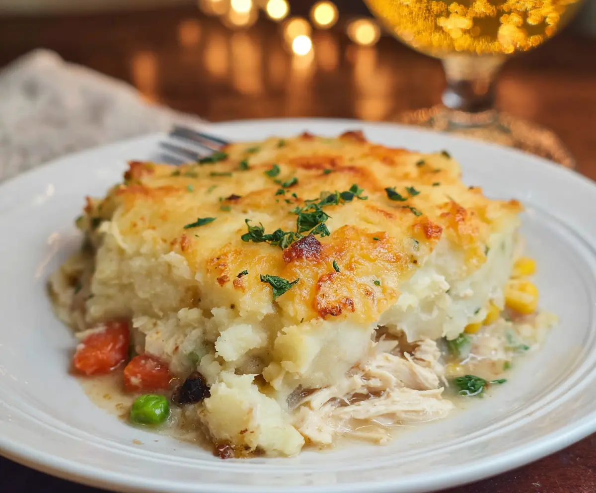 Delicious rotisserie chicken shepherd's pie topped with mashed potatoes and crispy golden crust.