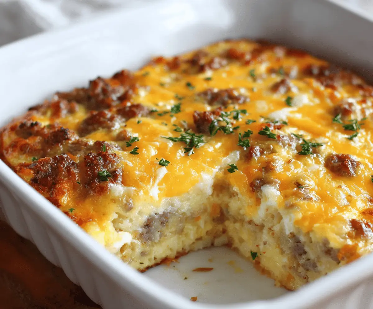 This hearty breakfast casserole combines tasty sausage, fluffy eggs, creamy cheese, and crispy hashbrowns. It’s like a warm hug to start your day!