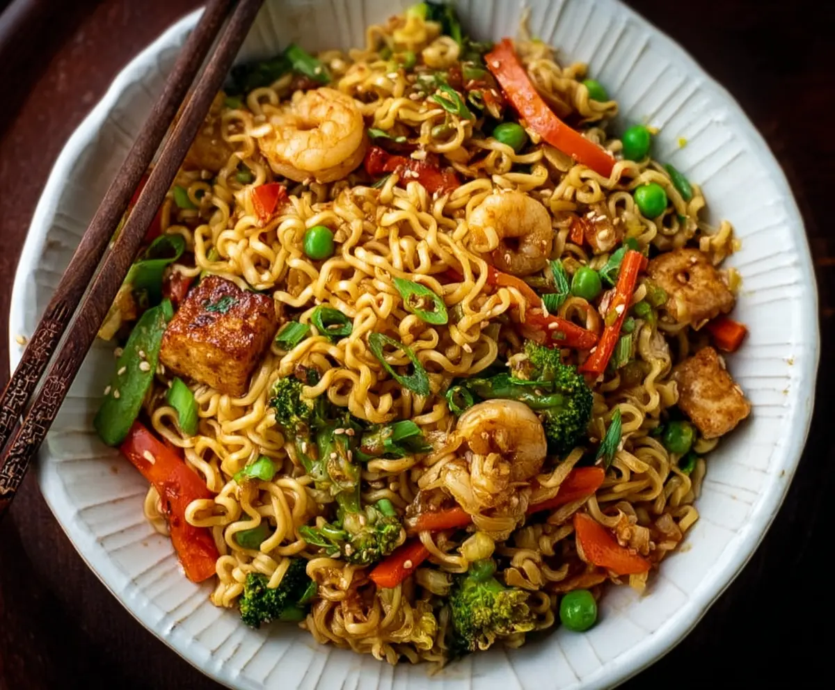 Delicious stir fry ramen noodles with colorful vegetables and savory sauce.
