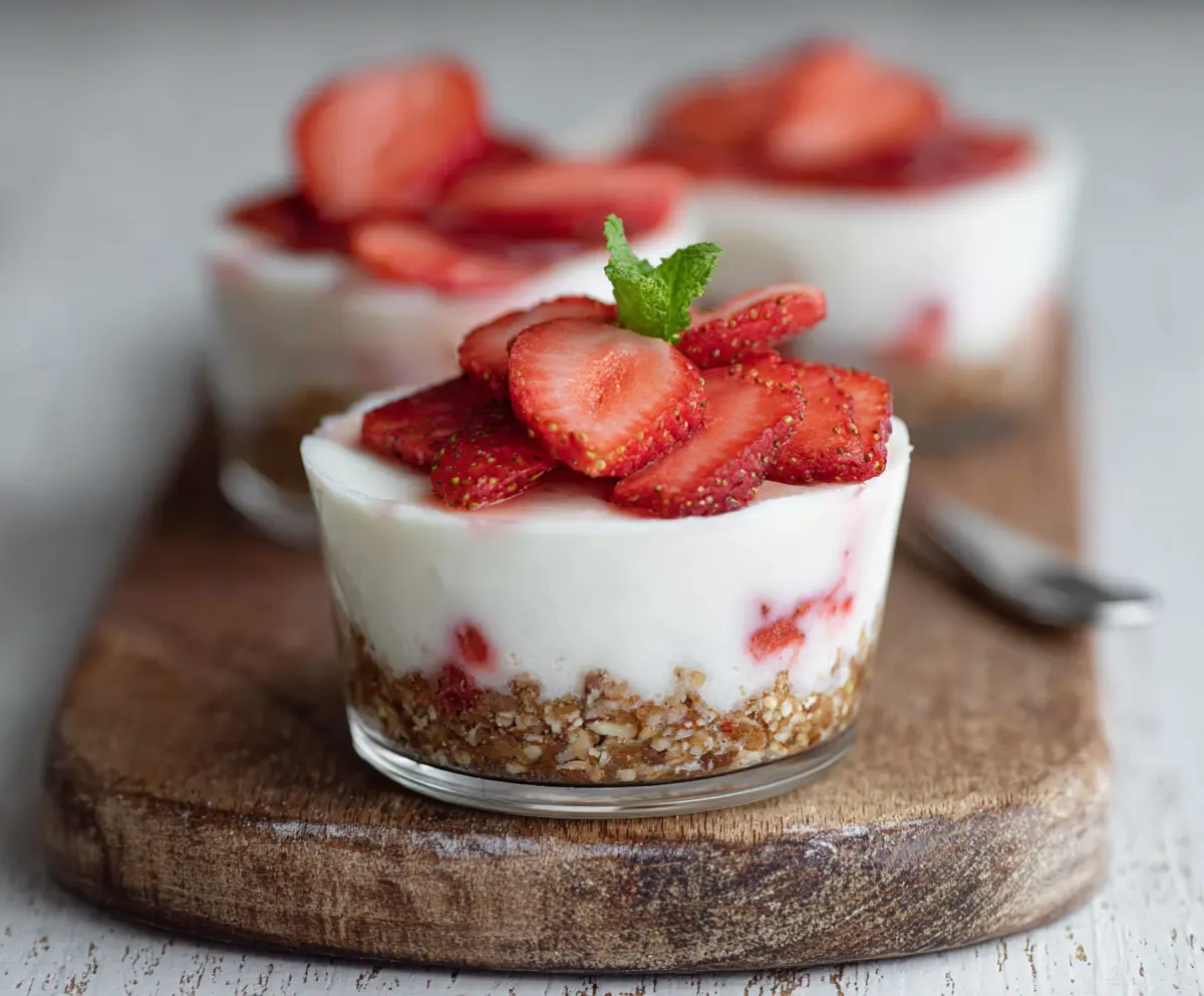 Before serving, mix the chopped fresh strawberries with strawberry jam or preserves (if you’re using it) to create a sweet fruity topping. Spoon this strawberry mixture over each protein cheesecake cup, and then garnish with fresh strawberry slices on top for a beautiful finish!