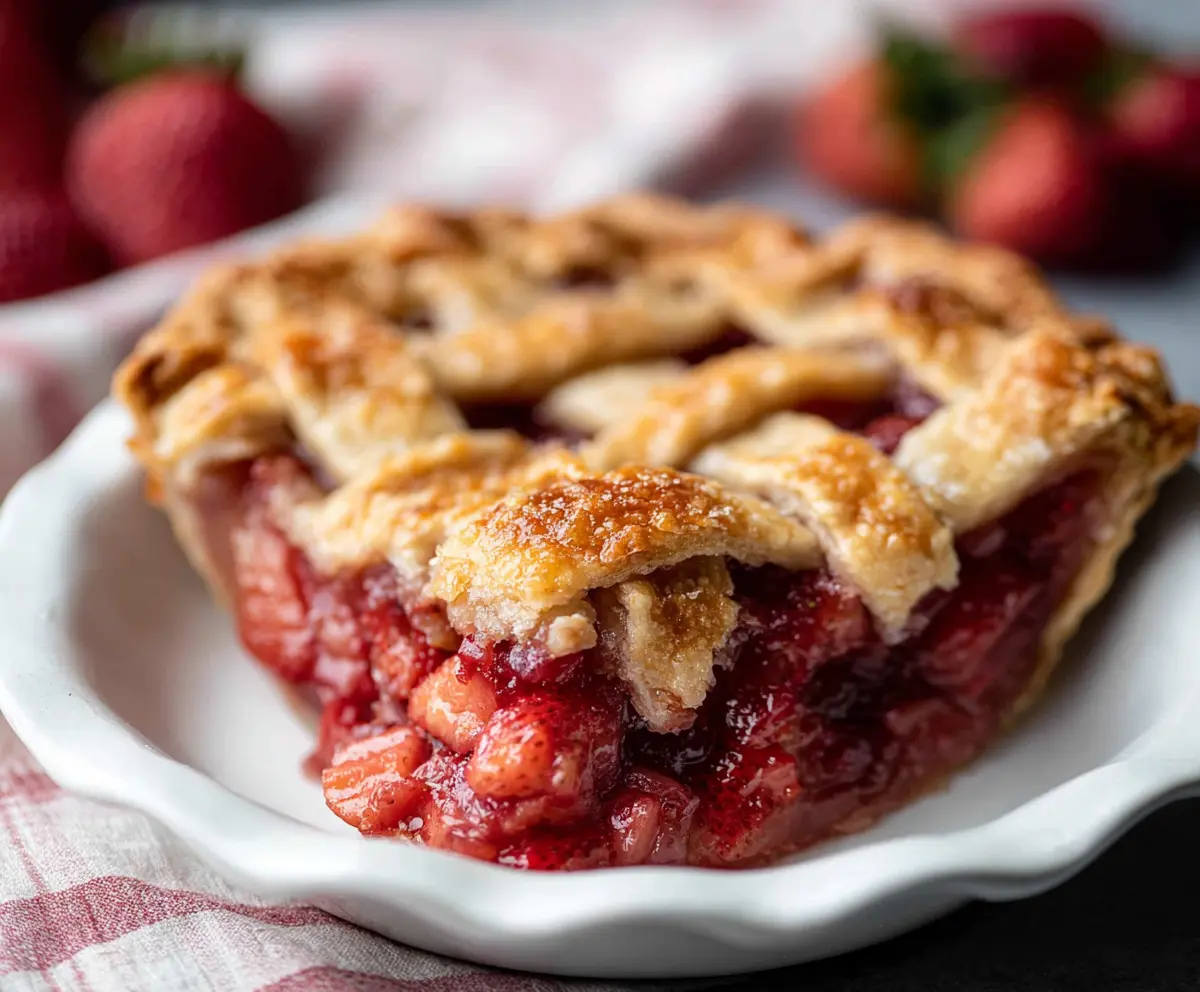 This Strawberry Rhubarb Pie is a sweet and tangy treat that pairs tart rhubarb with juicy strawberries. The flaky crust adds the perfect crunch to every bite!