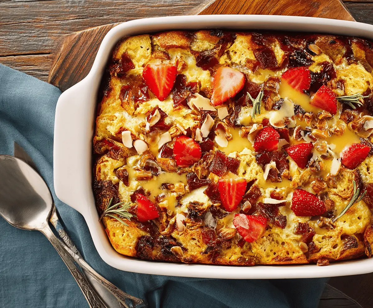This sweet breakfast casserole is a warm and cozy treat! Made with fluffy bread, eggs, and your favorite fruits like berries or bananas, it’s perfect for special mornings.