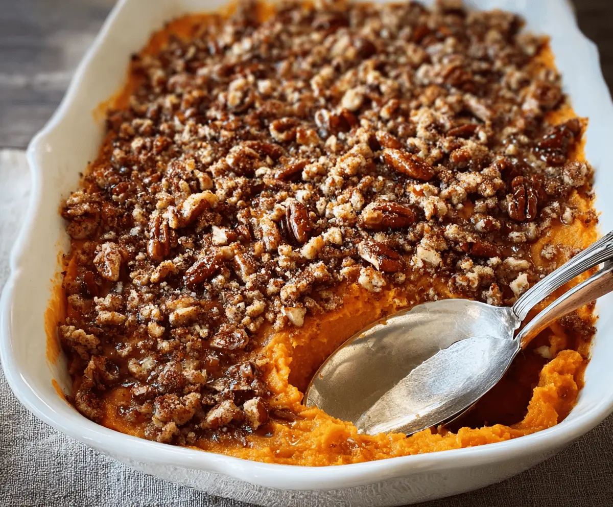This recipe yields a creamy sweet potato base complemented by a crunchy, buttery pecan streusel on top, making it a delightful side dish perfect for holidays or any cozy dinner.