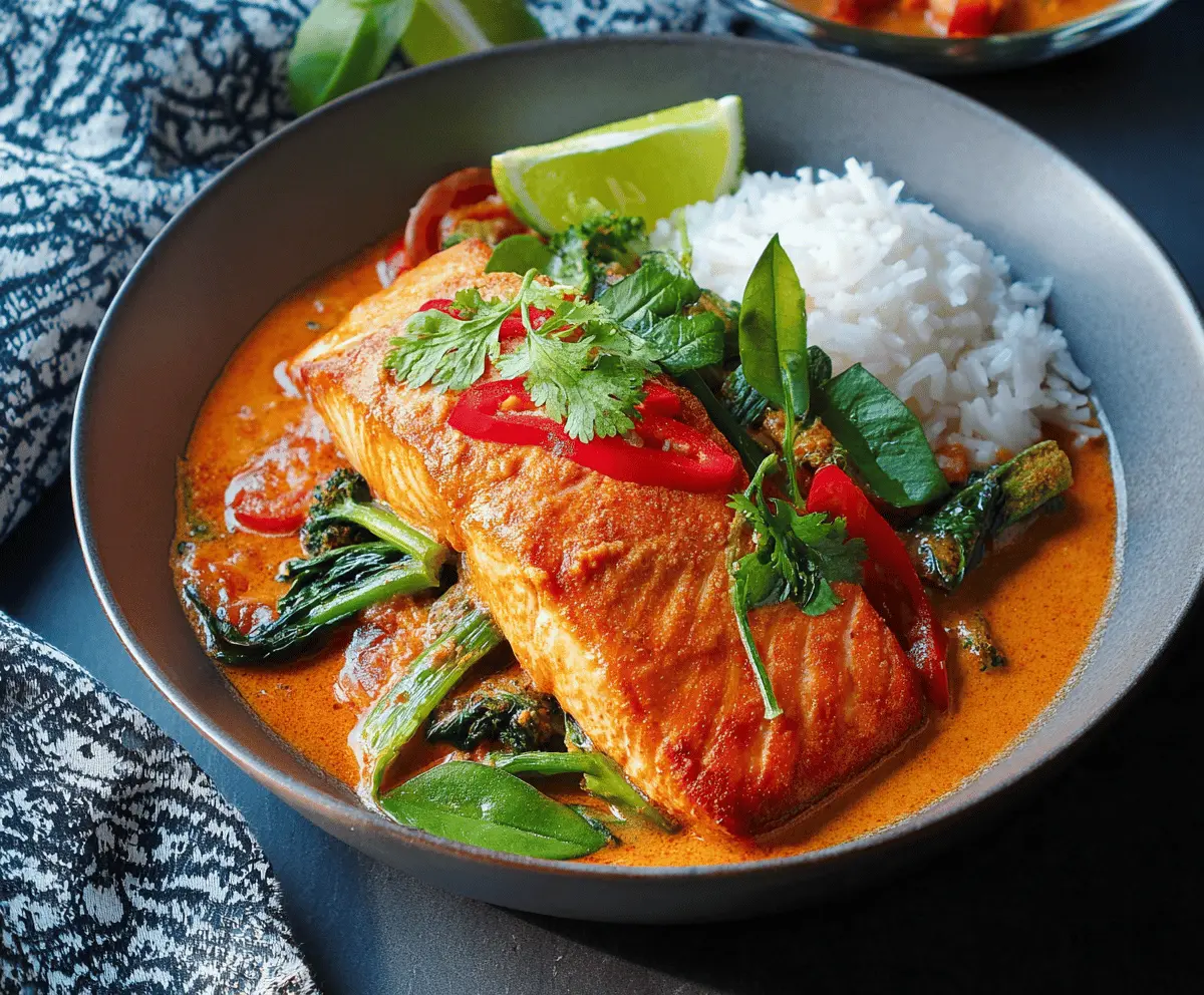 To serve, place the warm jasmine rice on a plate and ladle the salmon and curry sauce on top. Garnish with the reserved fresh Thai basil, extra chili slices, and lime wedges on the side for that extra zing. Dig in and enjoy your vibrant Thai Red Curry Salmon!